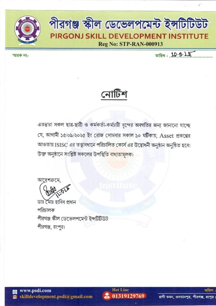 We’re delighted to welcome you to the official website of Pirgonj Skill Development Institute — where learning transforms into opportunity. Whether you’re looking to gain practical job skills, explore vocational training, or take the first step toward entrepreneurship, you’ve come to the right place.